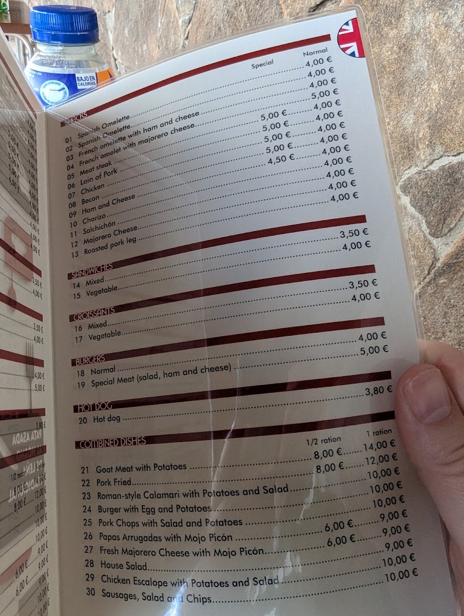 Food offerings include lighter fare such as sandwiches and local specialties. Highlighted dishes mentioned by customers include Tortilla Española, Cabrito, Ziege Mit Pommes und Gemüse, and Ensalada de la Casa y Papas Arrugadas con Mojo Picón, indicating a mix of Spanish and regional influences.